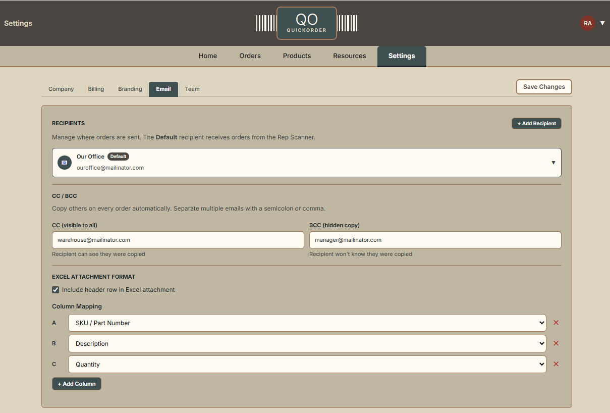 Control exactly how orders arrive in your inbox. Set up recipients, CC/BCC routing, and customize the Excel attachment to match your system.